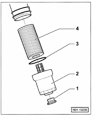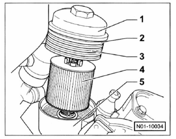 - Deckel - 1 - mit ölfiltereinsatz - 4 - herausnehmen. Ablaufendes motoröl mit lappen auffangen.