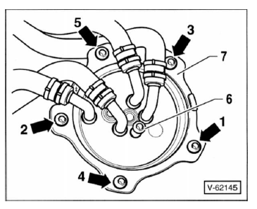 - Schrauben für kraftstofffilter-oberteil in der reihenfolge von 1 bis 5 bis zur anlage anschrauben und schließlich mit 5 nm festziehen, siehe abbildung v-62145. Achtung: schrauben nur über kreuz anziehen, wie in der abbildung dargestellt, sonst kann das oberteil verkanten und der dichtring beschädigt werden.