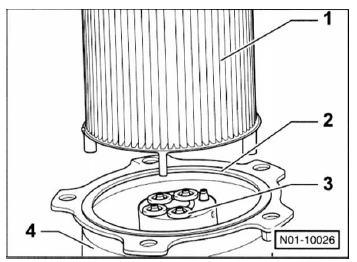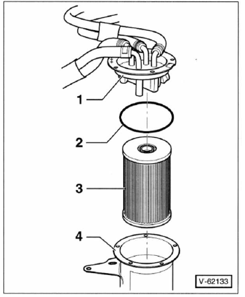 - Filtereinsatz - 1 - und dichtung - 2 - aus dem kraftstofffilter- unterteil - 4 - herausnehmen.