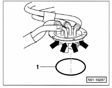 - Neuen dichtring - 1 - in die nut -pfeile- am kraftstofffilter- oberteil einsetzen.