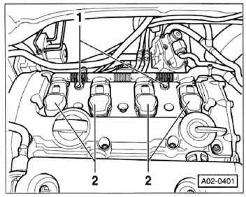 - Stecker der zündspulen - 2 - in richtung zündspulen drücken, von hand auf die verriegelung drücken und stecker abziehen, siehe abbildung a02-0401.