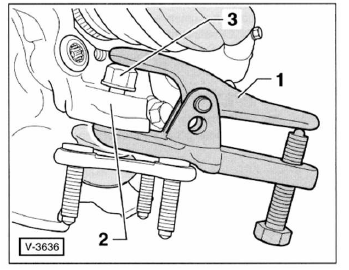 - Querlenker nach unten abziehen und achsgelenk mit kugelgelenkabzieher - 1 - , zum beispiel hazet 779-1, aus dem achsschenkel - 2 - herausdrücken.