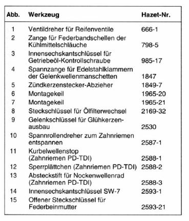 Gutes und stabiles werkzeug wird von der firma hazet (42804 remscheid, postfach 100461) angeboten. In den tabellen sind die werkzeuge mit der hazet-bestellnummer aufgeführt. Vertrieben wird das werkzeug über den fachhandel.