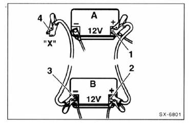 4. Das andere ende des schwarzen kabels - 4 - an eine gute massestelle - x - des empfängerfahrzeuges anschließen.
