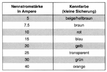 Die nennstromstärke der sicherung ist aufgedruckt. Außerdem ist die sicherung durch eine farbe gekennzeichnet, an der ebenfalls die nennstromstärke zu erkennen ist.