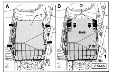 - Ab 05/04 - b - : verriegelungsschieber - 2 - nach vorne schieben -pfeile- und deckel - 1 - nach oben vom sicherungskasten abnehmen. Beim einbau deckel auf den sicherungskasten setzen, andrücken und dabei die schieber zum verriegeln nach hinten drücken.