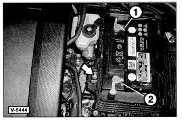 - Zuerst massekabel von der batterie abklemmen. Dazu mutter - 1 - lockern, klemme vom minuspol (-) abziehen und massekabel zur seite legen.