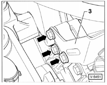 - 3 Schrauben -pfeile- herausdrehen und halter - 3 - zusammen mit riemenspanner herausnehmen.