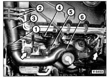 - 2 Schrauben -pfeile- für ladeluftrohr - 6 - oben herausdrehen.
