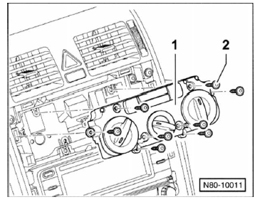 - 8 Schrauben - 2 - herausdrehen und heizungbedieneinheit - 1 - aus dem einbauschacht herausziehen. Dabei wird die heizungbedieneinheit vom adapter getrennt.