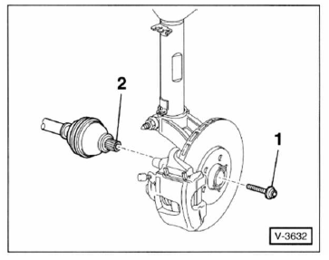 - Bremse durch helfer betätigen lassen und nabenschraube - 1 - aus der gelenkwelle - 2 - herausdrehen.