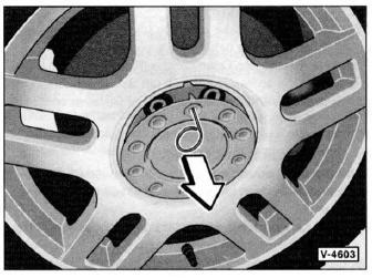 - Fahrzeuge mit mittenabdeckung: mittenabdeckung einsetzen und einrasten lassen. Dabei darauf achten, dass die nase an der abdeckung in die aussparung in der felge eingreift, siehe abbildung v-4603.