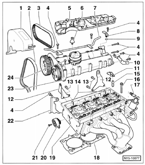 - Nockenwellengehäuse alte dichtmittelreste entfernen. Vor dem auflegen mit dichtmittel vwd188003a1 bestreichen, siehe abbildung n15-0075. Beim einbau vorsichtig senkrecht von oben auf die stehbolzen und passstifte aufsetzen.