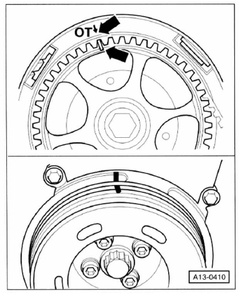 Kurbelwelle an der zentralschraube des zahnriemenrades in motordrehrichtung, also im uhrzeigersinn, drehen, bis die markierungen am nockenwellenrad -pfeile- und an der kurbelwelle übereinstimmen.