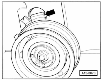 - Einbaulage der spannrolle überprüfen: die haltekralle -pfeil- muss in die aussparung am zylinderkopf eingreifen, andernfalls halterung entsprechend verdrehen.