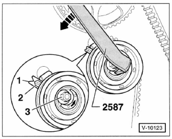 - Anschließend zahnriemen langsam entspannen, bis sich die kerbe - 1 - und der zeiger - 2 - gegenüberstehen. Zur kontrolle gegebenenfalls einen spiegel verwenden. In dieser stellung befestigungsmutter - 3 - mit 23 nm festziehen.
