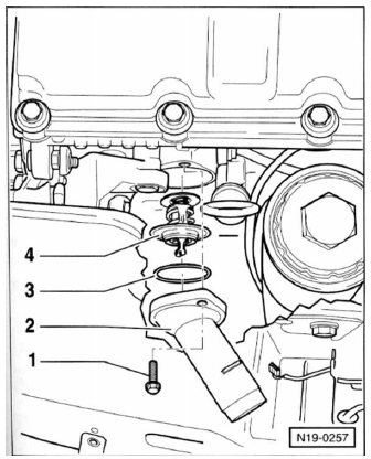 - Kühlmittelschlauch vom anschlussstutzen - 2 - am motorblock abziehen, vorher federbandschelle öffnen und zurückschieben. Hinweis: die abbildung zeigt den 1,9-1- dieselmotor/2,0-i-dieselmotor bdk.