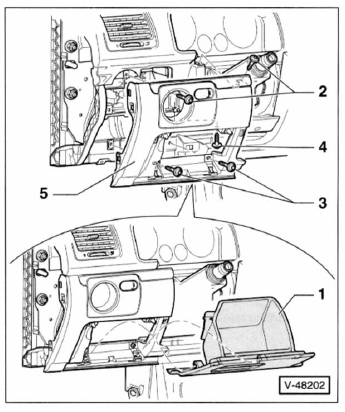 - Ablagefach - 1 - öffnen. Seitenwände des ablagefachs zusammendrücken und ablagefach über den anschlag hinaus ganz herausklappen. Ablagefach kräftig nach hinten ziehen, dabei unten an den scharnieren ausrasten und aus der armaturentafel herausziehen.