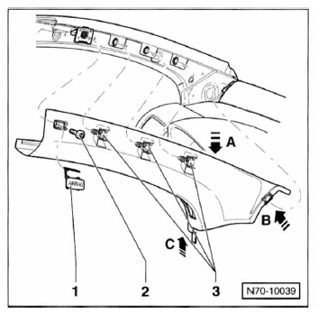 - Verkleidung aus der vorderen aufnahme herausziehen -pfeil b- und hinten aus der armaturentafel herausziehen -pfeil c-.
