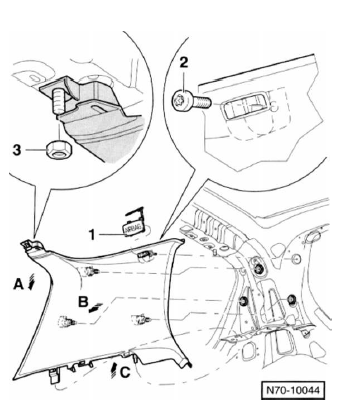 - Verkleidung an den halteclips aus den aufnahmen in der c-säule herausziehen -pfeil b-.