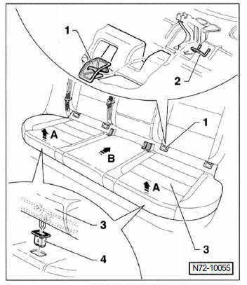 - Rücksitzbank - 3 - vorne anheben -pfeile a- und aus den 2 aufnahmen - 4 - am boden herausziehen.