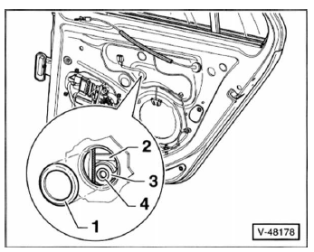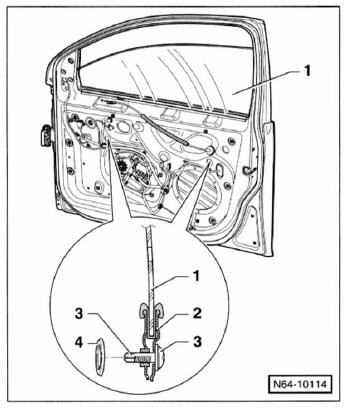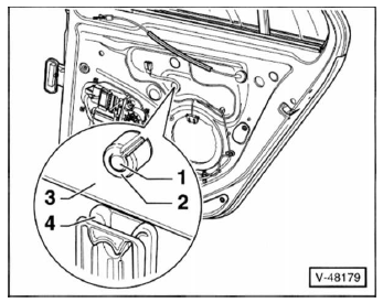 - Türfensterscheibe absenken, bis der spreizstift - 4 - und der spreizdübel - 3 - in der montageöffnung zugänglich sind. 2 - Fensterheberführung.