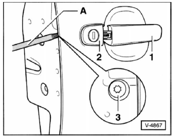 - Mit einem torx-steckschlüssel - a - schraube - 3 - soweit herausdrehen, bis die arretierung für den schließzylinder - 2 - entriegelt wird. Achtung: bei einigen fahrzeugen des touran-modelljahres 2004 darf die schraube nicht zu weit herausgedreht werden, da sonst der arretierungsring in die tür fallen kann.