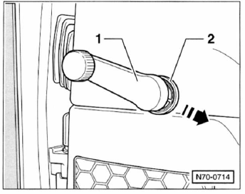 - Abstandsring - 2 - in pfeilrichtung schieben, dadurch wird die sicherungsklammer entriegelt. Gleichzeitig fensterkurbel - 1 - vom antrieb abziehen.
